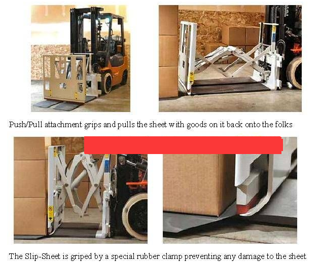 首先叉車是要經過改裝的插齒變成一塊整體光滑的平板并且一般要求材質304不銹鋼,然后就是要加裝一個液壓推擠裝置。推擠裝置有一個類似卡子的東西可以卡住滑托盤。