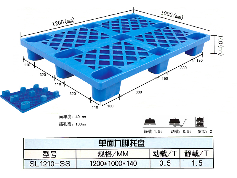 注:九腳網格托盤內部可加入鋼管,是為了達到增加承載的目的,延長托盤的使用壽命,塑料托盤如要在低溫環境中長期使用,要選擇全新料生產的產品。